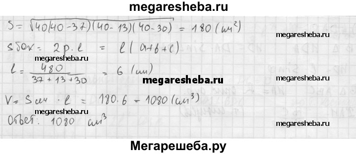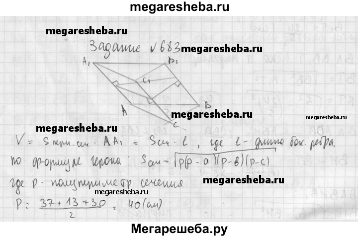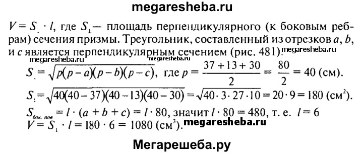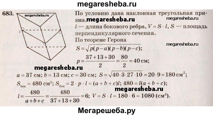 683. Найдите объем наклонной треугольной призмы, если расстояния между ее боковыми ребрами равны 37 см, 13 см и 30 см, а площадь боковой поверхности равна 480 см².
