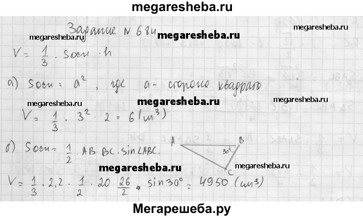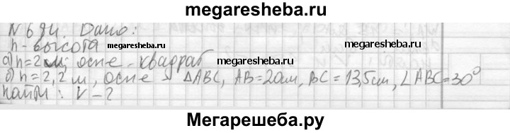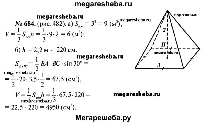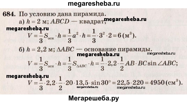 684. Найдите объем пирамиды с высотой h, если: а) h = 2 м, а основанием служит квадрат со стороной 3 м; б) h = 2,2 м, а основанием служит треугольник ABC, в котором АВ = 20 см, ВС = 13,5 см, угол ABC = 30°.
