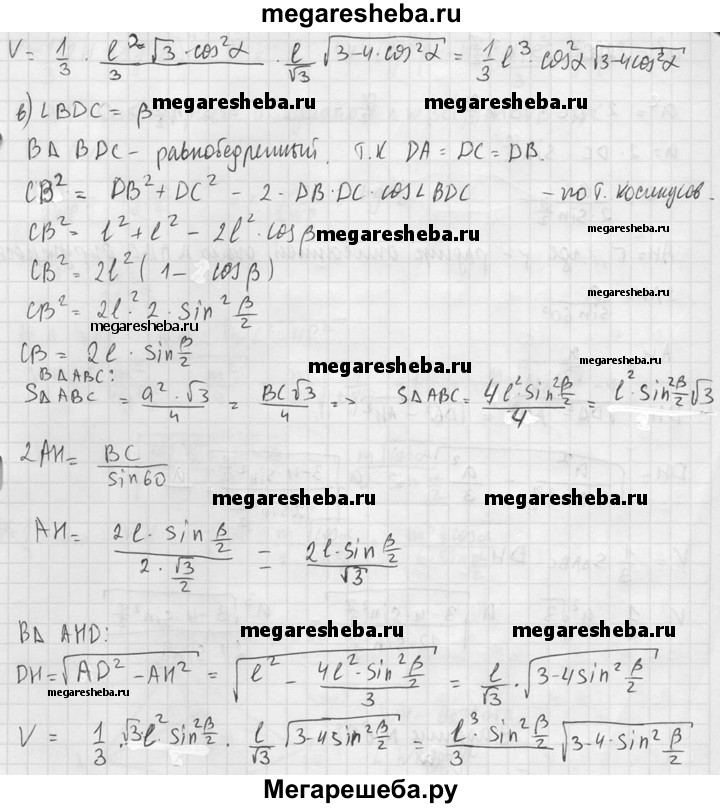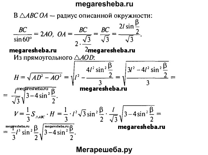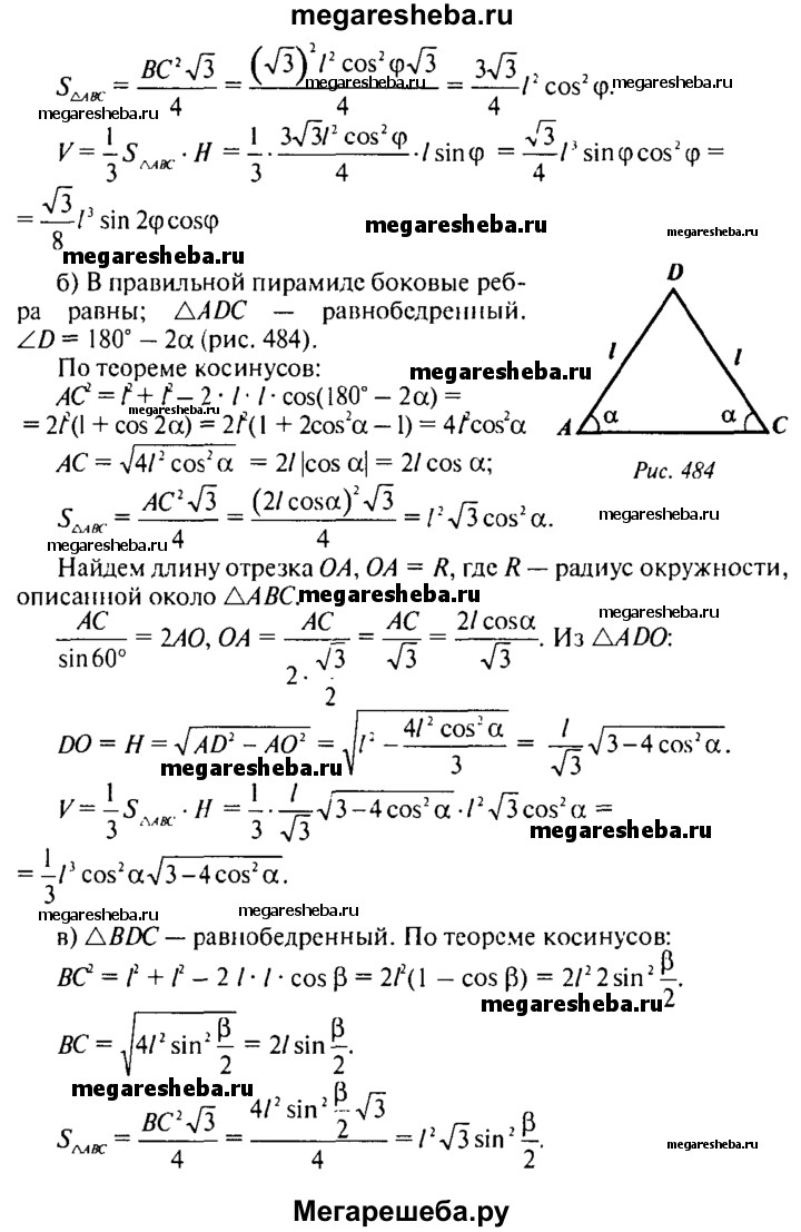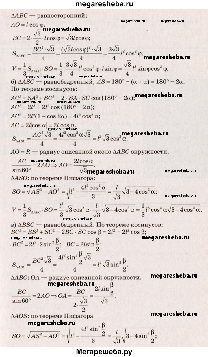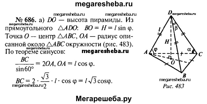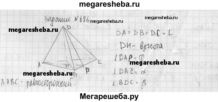 686. Найдите объем правильной треугольной пирамиды с боковым ребром l, если: а) боковое ребро составляет с плоскостью основания угол ф; б) боковое ребро составляет с прилежащей стороной основания угол α; в) плоский угол при вершине равен β.