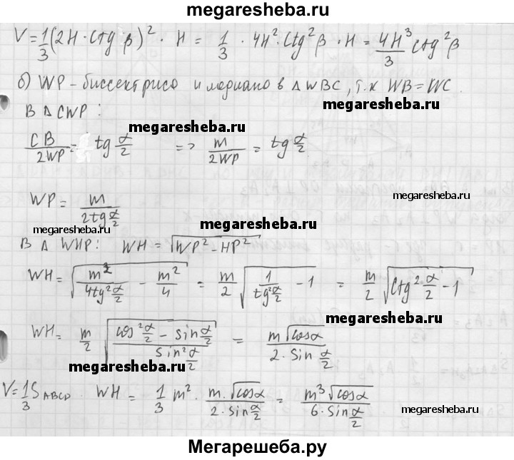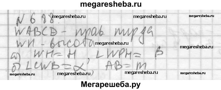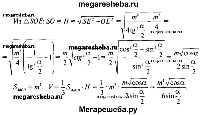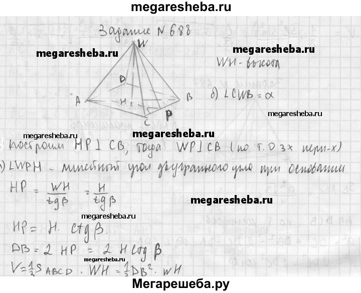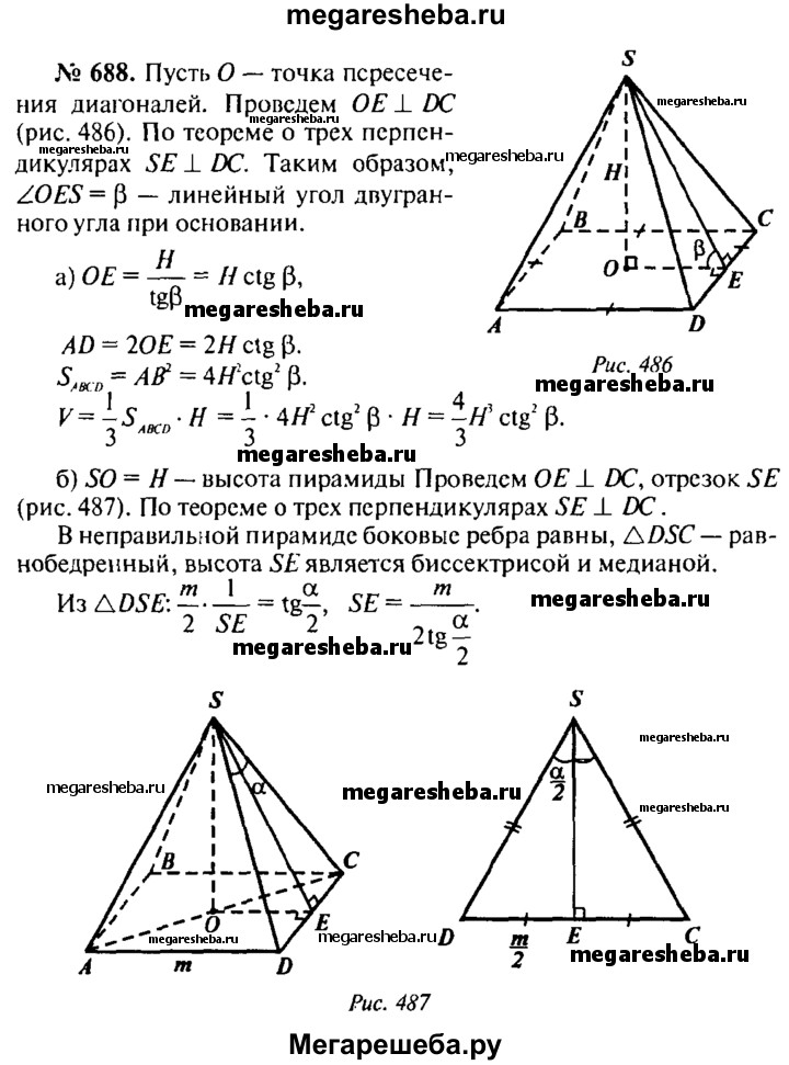 688. Найдите объем правильной четырехугольной пирамиды, если: а) ее высота равна Н, а двугранный угол при основании равен β; б) сторона основания равна m, а плоский угол при вершине равен α.