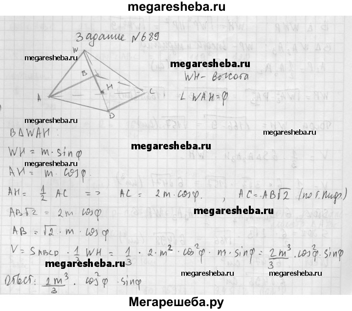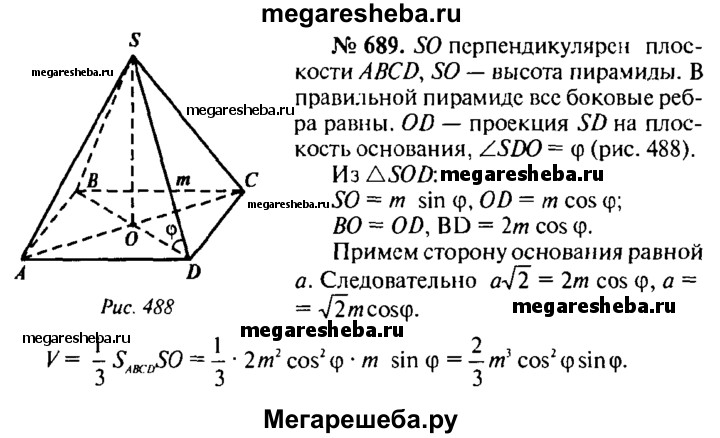 689. Боковое ребро правильной четырехугольной пирамиды равно m и составляет с плоскостью основания угол ф. Найдите объем пирамиды.