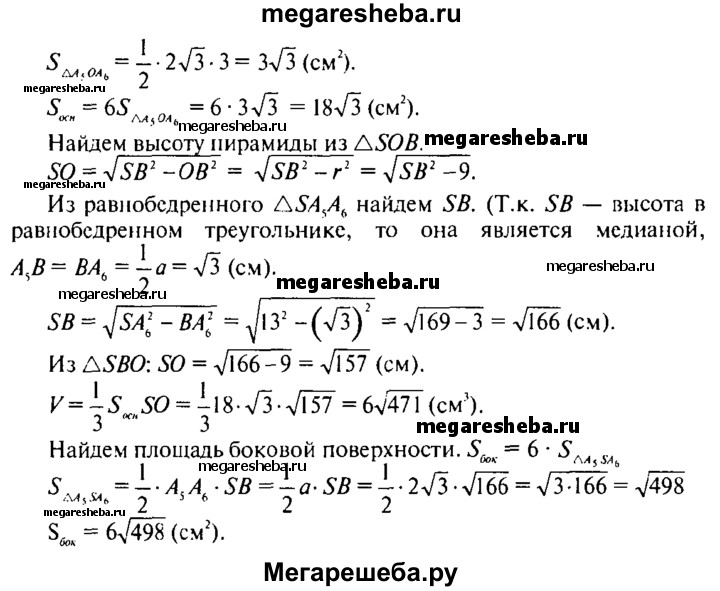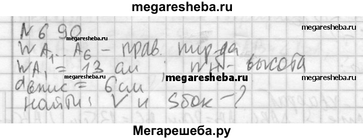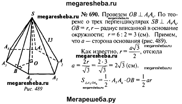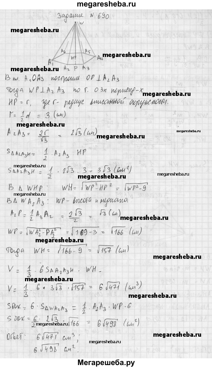 690. Найдите объем и площадь боковой поверхности правильной шестиугольной пирамиды, если ее боковое ребро равно 13 см, а диаметр круга, вписанного в основание, равен 6 см.