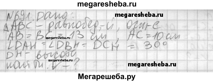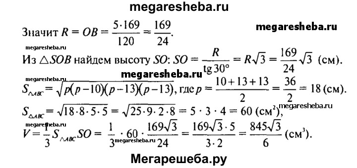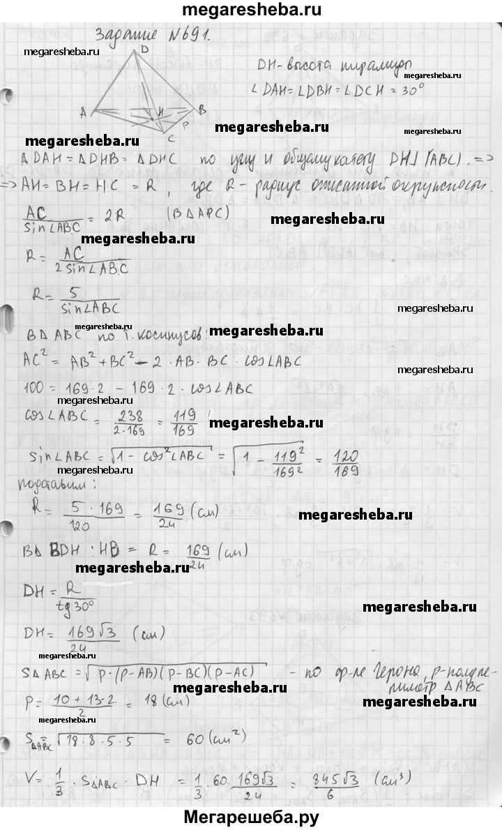 691. Основание пирамиды — равнобедренный треугольник ABC, в котором АВ = ВС = 13 см, АС = 10 см. Каждое боковое ребро пирамиды образует с ее высотой угол в 30°. Вычислите объем пирамиды.
