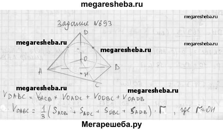 693. Докажите, что если в пирамиду можно вписать шар, то объем V пирамиды можно вычислить по формуле V = 1/3 S • r, где S — площадь полной поверхности пирамиды, а r — радиус вписанного в пирамиду шара.