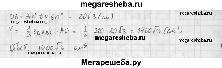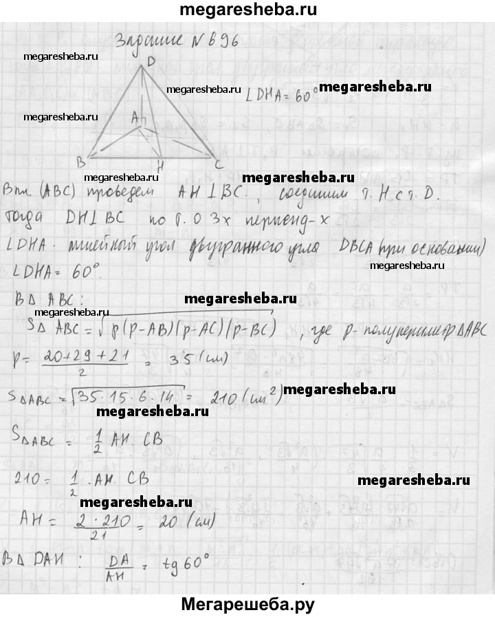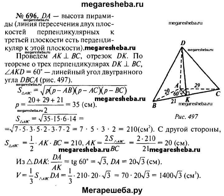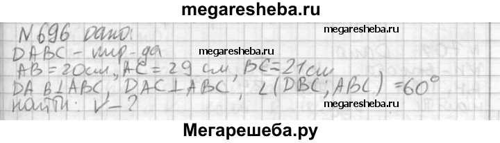 696. Основанием пирамиды DABC является треугольник, в котором АВ = 20 см, АС = 29 см, ВС = 21 см. Грани DAB и DAC перпендикулярны к плоскости основания, а грань DBC составляет с ней угол в 60°. Найдите объем пирамиды.