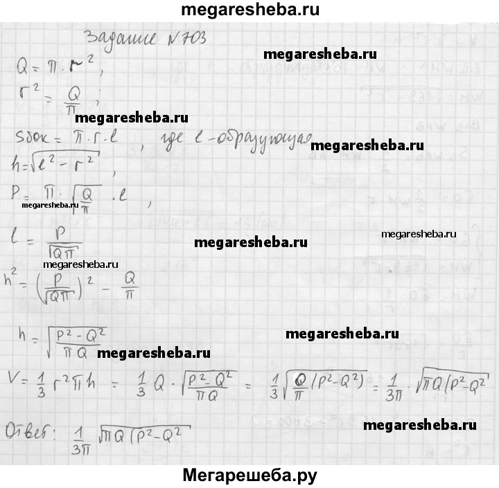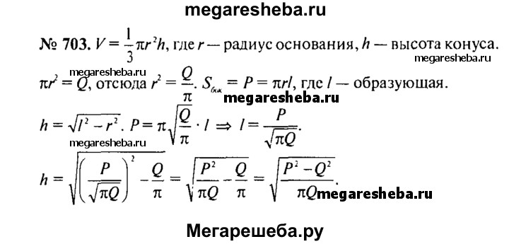 703. Найдите объем конуса, если площадь его основания равна Q, а площадь боковой поверхности равна Р.