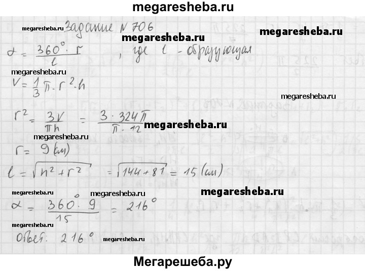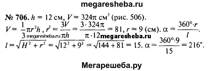 706. Высота конуса равна 12 см, а его объем равен 324л см³. Найдите угол сектора, который получится, если боковую поверхность конуса развернуть на плоскость.