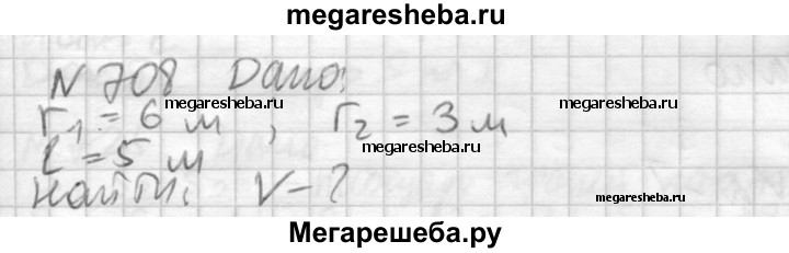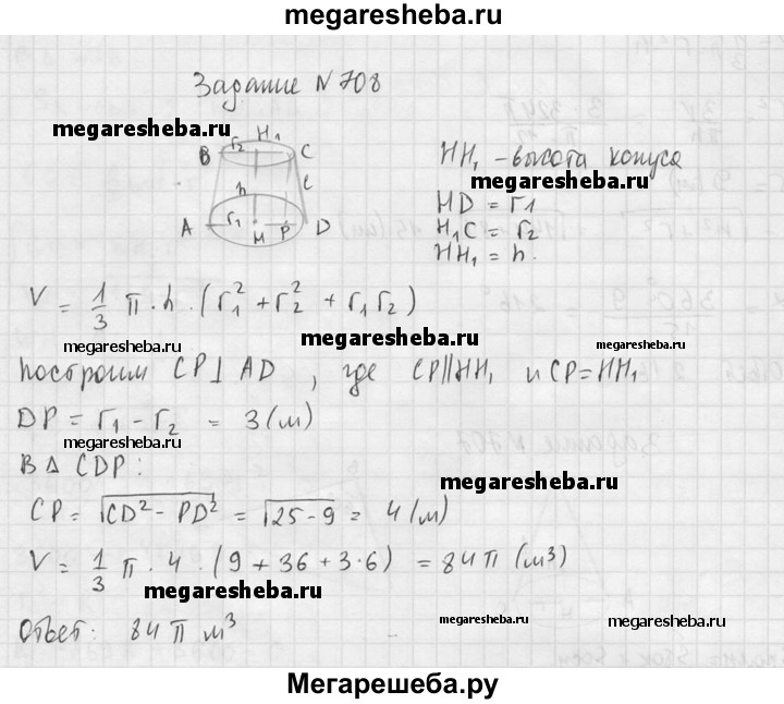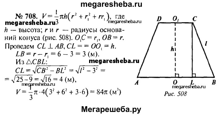 708. Радиусы оснований усеченного конуса равны 3 м и 6 м, а образующая равна 5 м. Найдите объем усеченного конуса.