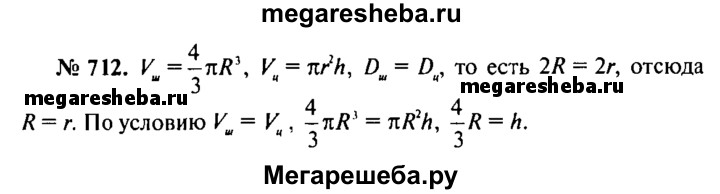 712. Шар и цилиндр имеют равные объемы, а диаметр шара равен диаметру основания цилиндра. Выразите высоту цилиндра через радиус шара.
