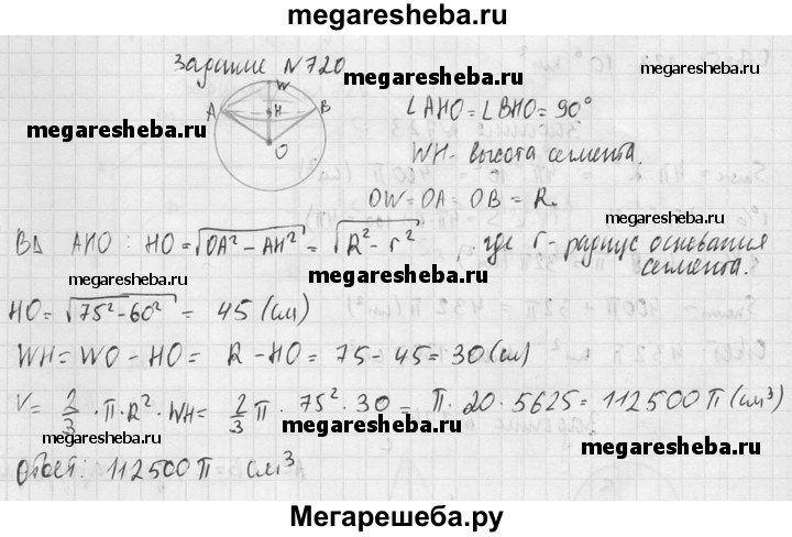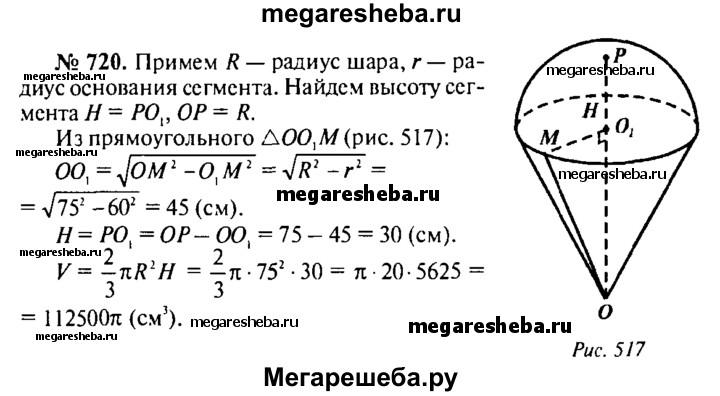 720. Найдите объем шарового сектора, если радиус окружности основания соответствующего шарового сегмента равен 60 см, а радиус шара равен 75 см.