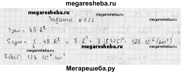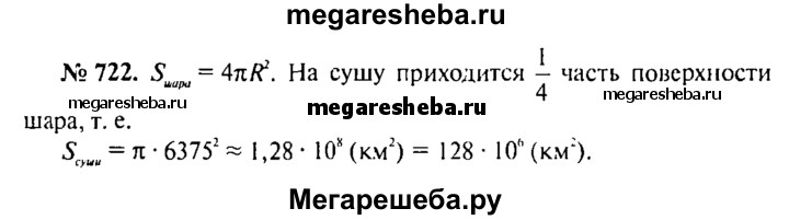 722. Вода покрывает приблизительно 3/4 земной поверхности. Сколько квадратных километров земной поверхности занимает суша? (Радиус Земли считать равным 6375 км.)