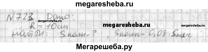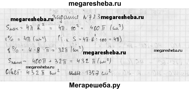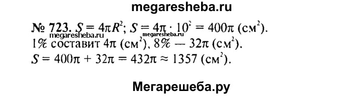 723. Сколько кожи пойдет на покрышку футбольного мяча радиуса 10 см? (На швы добавить 8% от площади поверхности мяча.)