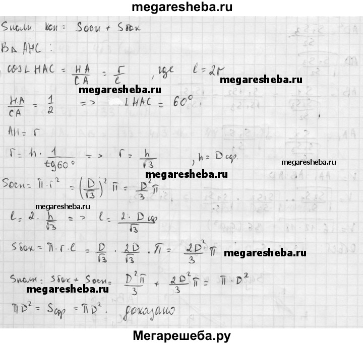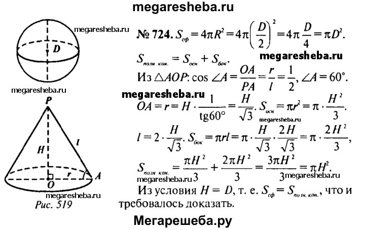 724. Докажите, что площадь сферы равна площади полной поверхности конуса, высота которого равна диаметру сферы, а диаметр основания равен образующей конуса.