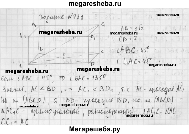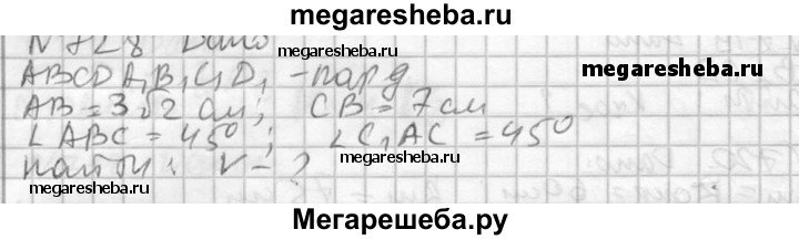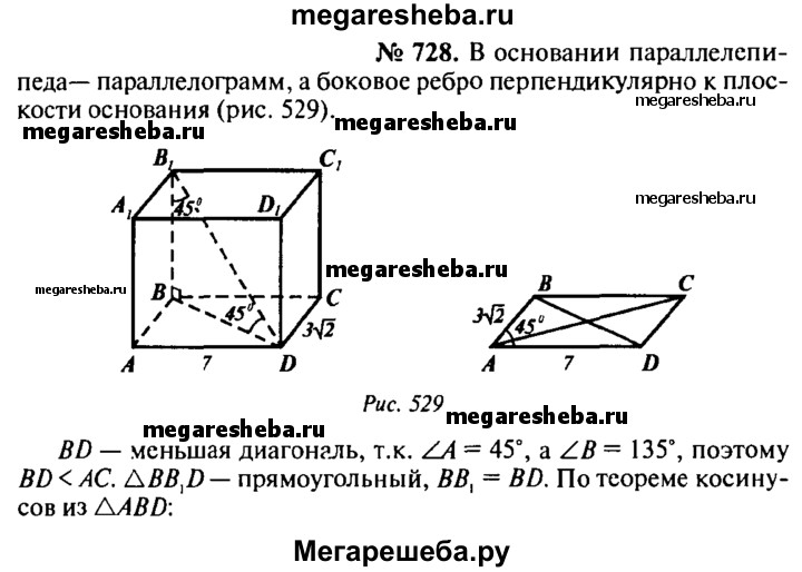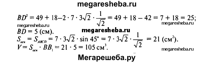 728. Стороны основания прямого параллелепипеда равны 7 см и 3√2 см, а острый угол основания равен 45°. Меньшая диагональ параллелепипеда составляет угол в 45° с плоскостью основания. Найдите объем параллелепипеда.