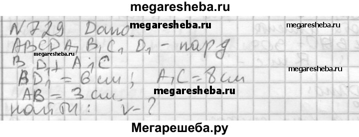 729. В прямом параллелепипеде ABCDA₁B₁C₁D₁ диагонали BD₁ и А₁С взаимно перпендикулярны и равны 6 см и 8 см, АВ = 3 см. Найдите объем параллелепипеда.