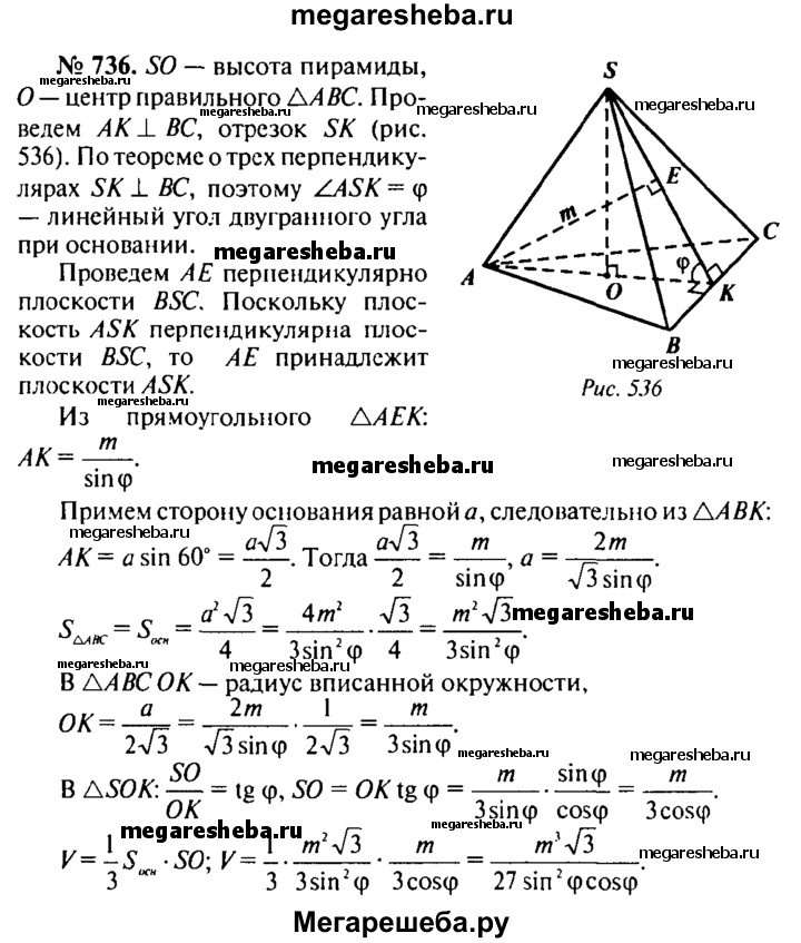 736. Найдите объем правильной треугольной пирамиды, если боковая грань составляет с плоскостью основания угол ф, а не лежащая в этой грани вершина основания находится на расстоянии m от нее.