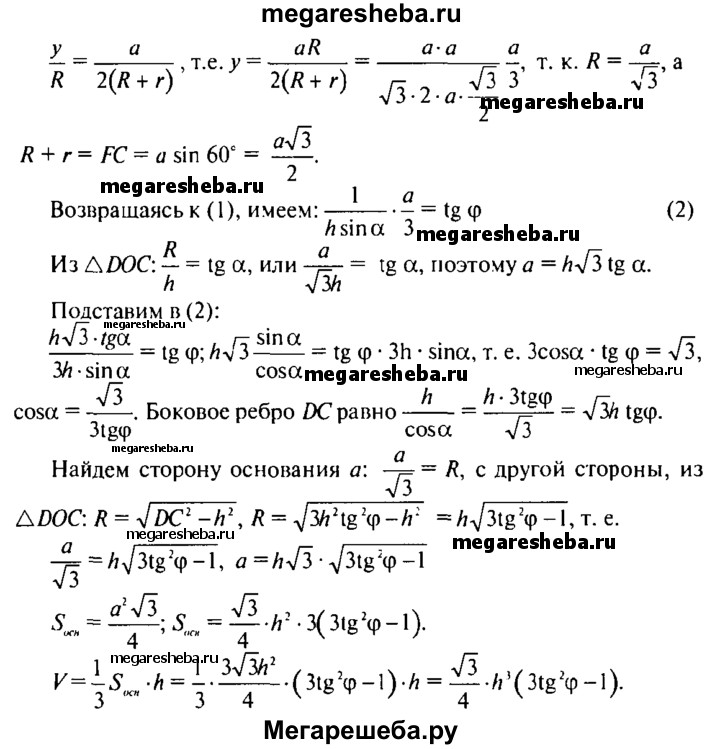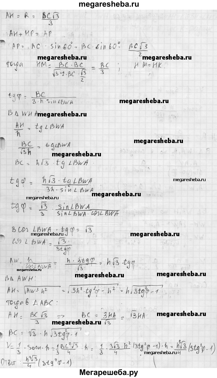 738. Высота правильной треугольной пирамиды равна h, а двугранный угол, ребром которого является боковое ребро пирамиды, равен 2ф. Найдите объем пирамиды.