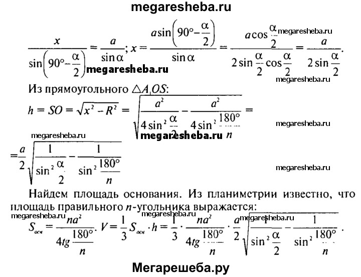 739. В правильной n-угольной пирамиде плоский угол при вершине равен α , а сторона основания равна а. Найдите объем пирамиды.