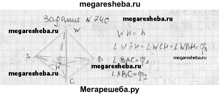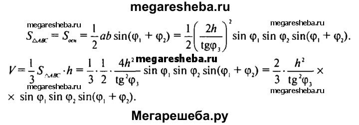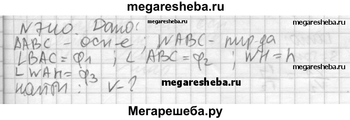 740. Основанием пирамиды является треугольник, два угла которого равны ф₁ и ф₂. Высота пирамиды равна h, а каждое боковое ребро составляет с плоскостью основания угол ф₃. Найдите объем пирамиды.