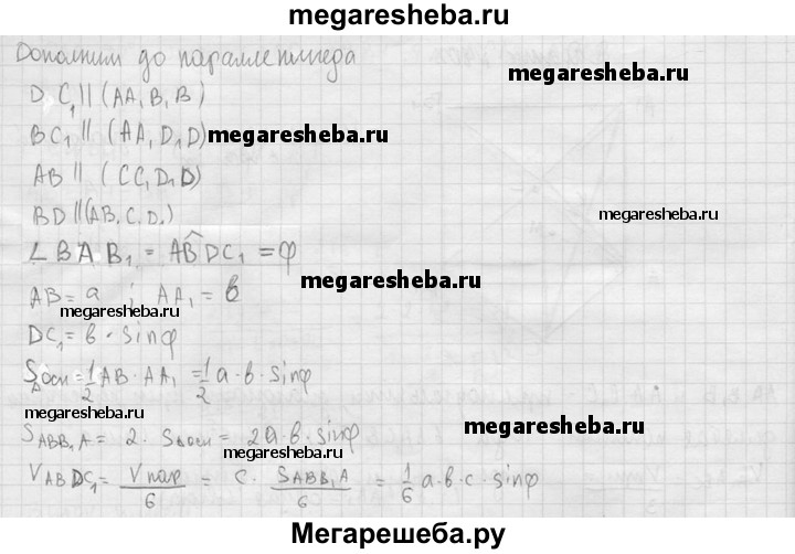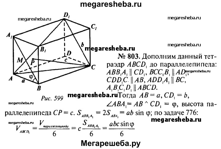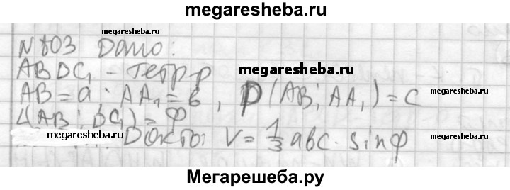 803. Докажите, что объем тетраэдра равен 1/6 abc sin ф, где а и b — противоположные ребра, а ф и с — соответственно угол и расстояние между ними.