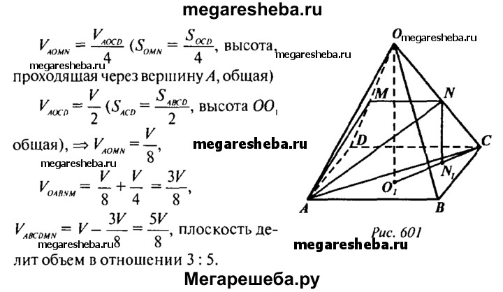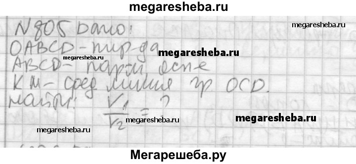 805. Основанием пирамиды OABCD является параллелограмм ABCD. В каком отношении делит объем пирамиды плоскость, проходящая через прямую АВ и среднюю линию грани OCD?