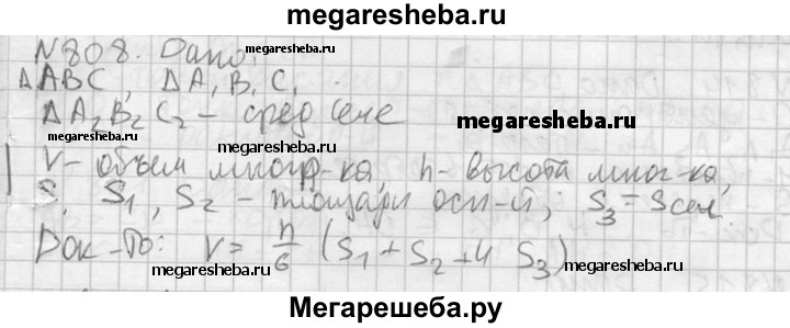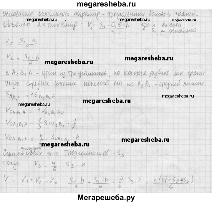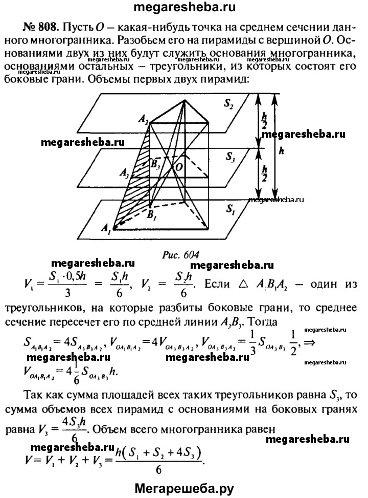 808. В двух параллельных плоскостях взяты два многоугольника. Их вершины соединены отрезками так, что у полученного многогранника все боковые грани — трапеции, треугольники и параллелограммы. Докажите, что V = h/6(S₁+S₂+4S₃), где V — объем многогранника, h — его высота, S₁ и S₁ — площади оснований, a S₃ — площадь сечения плоскостью, параллельной плоскостям оснований и равноудаленной от них.