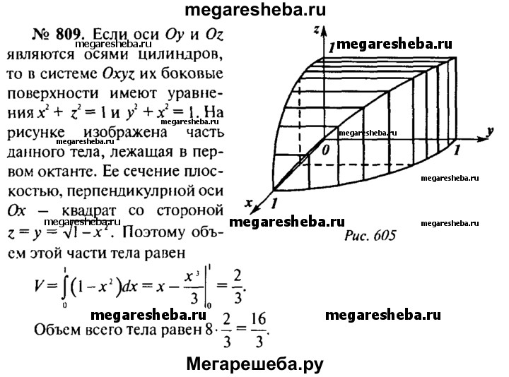 809. Два равных цилиндра, высоты которых больше их диаметров, расположены так, что их оси пересекаются под прямым углом и точка пересечения осей равноудалена от оснований цилиндров. Найдите объем общей части этих цилиндров, если радиус каждого из них равен 1 см.
