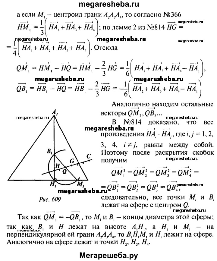 815. Дан тетраэдр, все высоты которого пересекаются в одной точке. Докажите, что точки пересечения медиан всех граней, основания высот тетраэдра и точки, которые делят каждый из отрезков, соединяющих точку пересечения высот с вершинами, в отношении 2:1, считая от вершины, лежат на одной сфере, центр которой расположен на прямой Эйлера (сфера Эйлера).