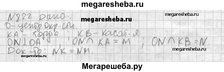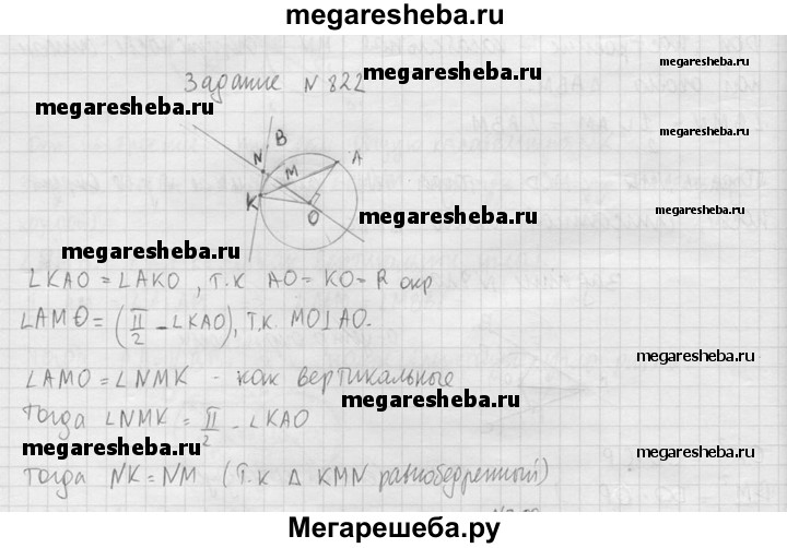 822. Через точку К, лежащую на окружности с центром О, проведены хорда КА и касательная KB, а через точку О проведена прямая, перпендикулярная к прямой OA и пересекающая хорду КА в точке М, а касательную KB — в точке N. Докажите, что NK = NM.