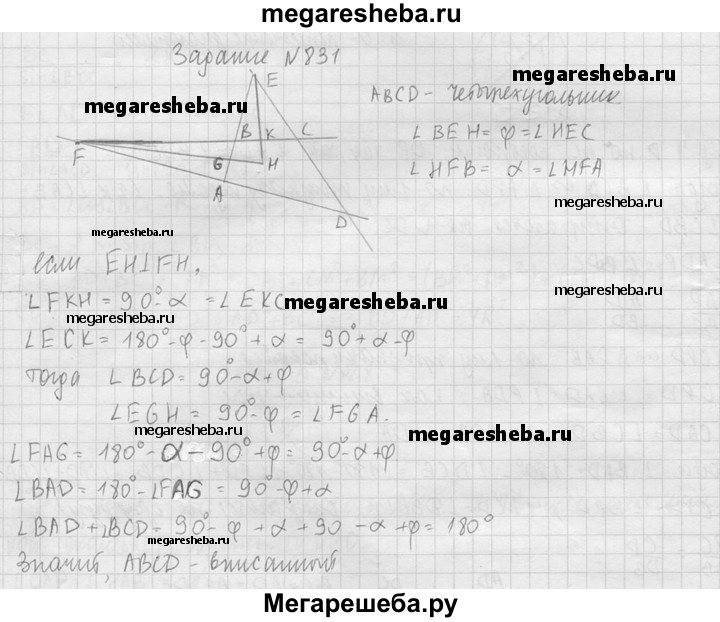 831. Противоположные стороны выпуклого четырехугольника продолжены до пересечения. Докажите, что около четырехугольника можно описать окружность тогда и только тогда, когда биссектрисы образовавшихся углов взаимно перпендикулярны.