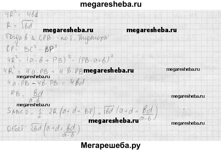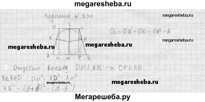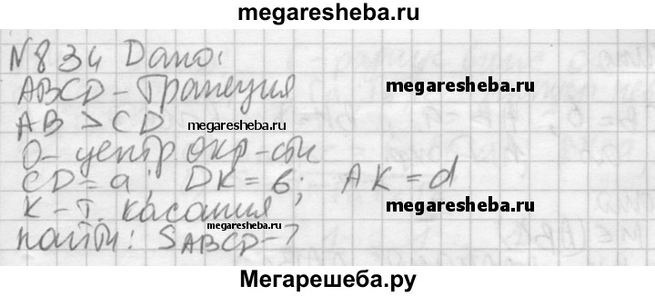 834. В трапецию ABCD с основаниями АВ и CD (АВ > CD) вписана окружность. Найдите площадь трапеции, если CD = a, DK = b и АК = d, где К — точка касания окружности и стороны AD.
