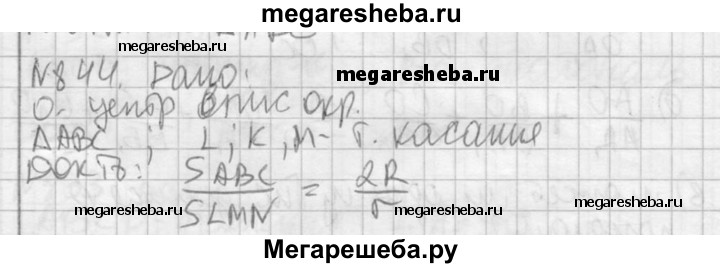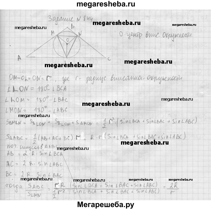 844. Окружность, вписанная в треугольник ABC, касается его сторон в точках L, М и N. Докажите, что отношение площади треугольника LMN к площади треугольника ABC равно отношению радиуса окружности, вписанной в треугольник ABC, к диаметру окружности, описанной около этого треугольника.