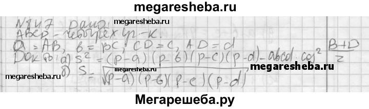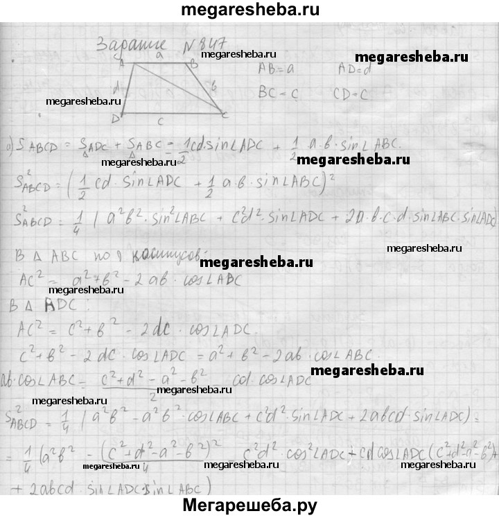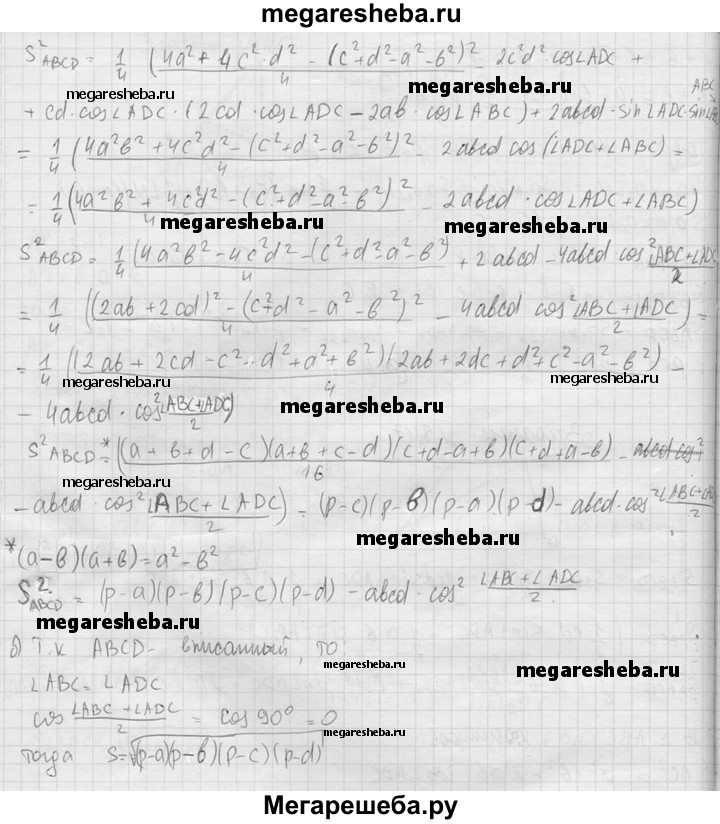 847. Докажите, что: а) квадрат площади S выпуклого четырехугольника со сторонами а, b, с, d и полупериметром р выражается формулой S² = (р - а) (р - b) (р - с) (р - d) -- abcd cos² B+D/2 б) площадь S вписанного четырехугольника выражается формулой √(p-a)(p-b)(p-c)(p-d); исходя из этой формулы, получите формулу Герона для площади треугольника.