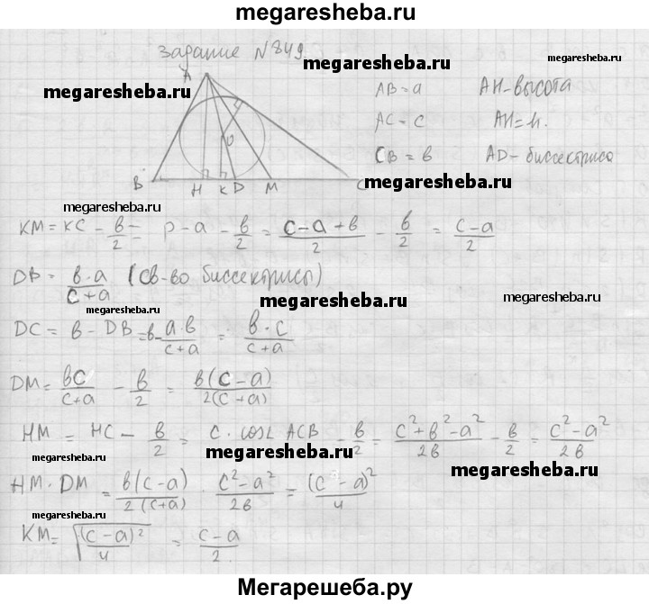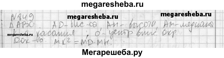 849. Отрезки AD, АН и AM — биссектриса, высота и медиана треугольника ABC, вписанная в треугольник окружность касается стороны ВС в точке К. Докажите, что МК2 = MD • МН.