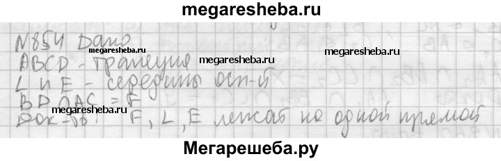 854. Докажите, что середины оснований трапеции, точка пересечения ее диагоналей и точка пересечения продолжений боковых сторон лежат на одной прямой.