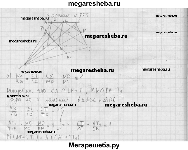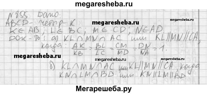 855. На сторонах АВ, ВС, CD и DA четырехугольника ABCD отмечены соответственно точки К, L, М и N, не совпадающие с вершинами четырехугольника. Докажите, что: а) прямые KL, MN и АС пересекаются в одной точке или параллельны друг другу тогда и только тогда, когда AK/KB • BL/LC • CM/MD • DN/NA = 1; б) прямые KL, MN и АС пересекаются в одной точке или параллельны друг другу тогда и только тогда, когда это же верно в отношении прямых KN, LM и BD.