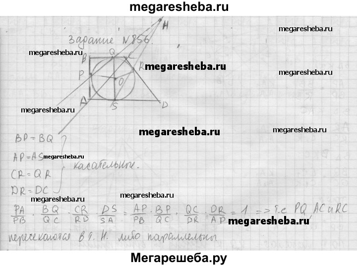 856. Окружность, вписанная в четырехугольник ABCD, касается сторон АВ, ВС, CD и DA соответственно в точках Р, Q, R и S. Докажите, что прямые PQ, RS и АС пересекаются в одной точке или параллельны друг другу.
