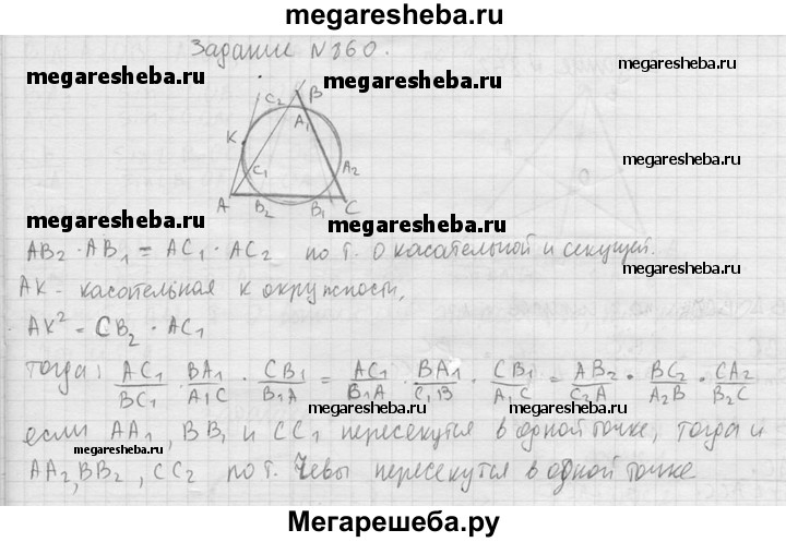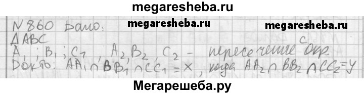 860. Окружность пересекает сторону ВС треугольника ABC в точках А₁ и А₂, сторону АС — в точках B₁ и В₂, сторону АВ — в точках С₁ и С₂. Докажите, что отрезки АА₁, ВВ₁ и СС₁ пересекаются в одной точке тогда и только тогда, когда отрезки АА₂, ВВ₂ и СС₂ пересекаются в одной точке.