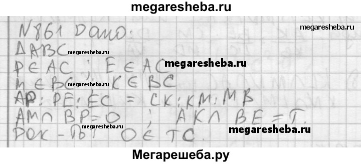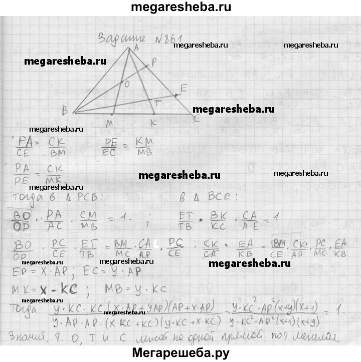 861. На стороне АС треугольника ABC отмечены точки Р и Е, а на стороне ВС — точки М и К, причем АР : РЕ : ЕС = СК : КМ : MB. Отрезки AM и BP пересекаются в точке О, а отрезки АК и BE — в точке Т. Докажите, что точки О, Т и С лежат на одной прямой.