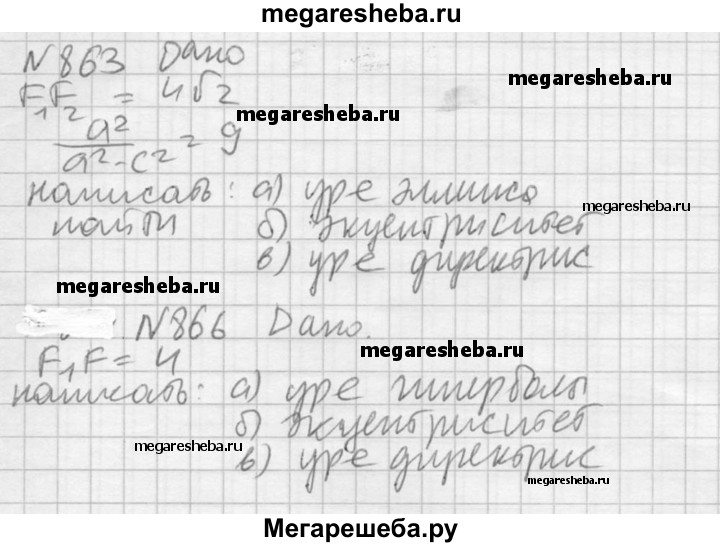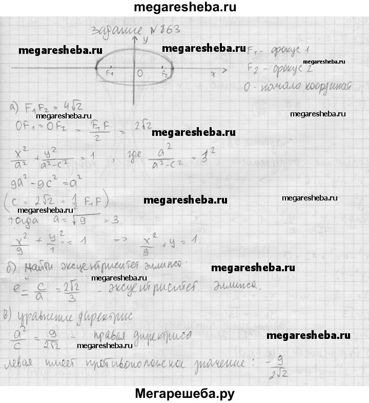 863. Расстояние между двумя фокусами эллипса равно 4√2, а отношение большой и малой полуосей равно 3. а) Напишите уравнение этого эллипса в системе координат Оху, где О — середина отрезка, соединяющего фокусы, лежащие на оси Ох. б) Найдите эксцентриситет эллипса, в) Напишите уравнение директрис эллипса в системе координат Оху.