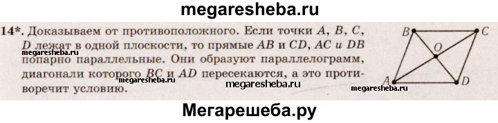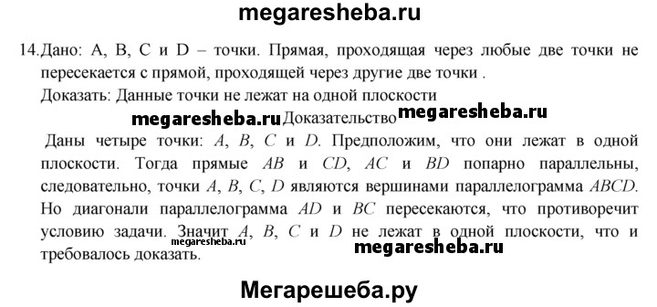 14.Даны четыре точки. Известно, что прямая, проходящая через любые две из этих точек, не пересекается с прямой, проходящей через другие две точки. Докажите, что данные четыре точки не лежат в одной плоскости.