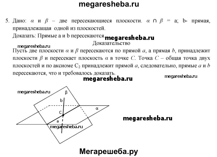 5.Даны две плоскости, пересекающиеся по прямой а, и прямая b, которая лежит в одной из этих плоскостей и пересекает другую. Докажите, что прямые а и b пересекаются.