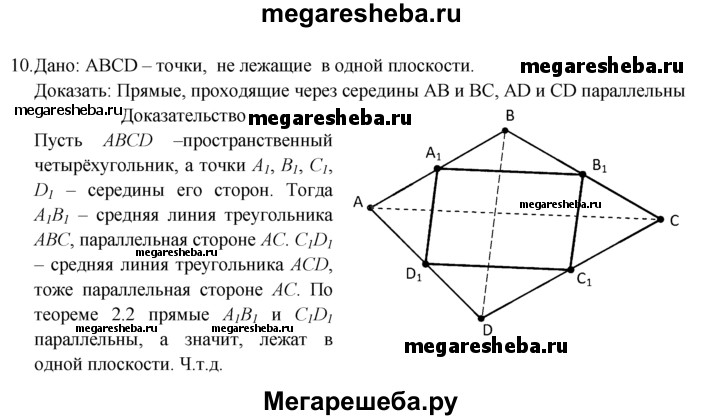 10.Точки А, В, С, D не лежат в одной плоскости. Докажите, что прямая, проходящая через середины отрезков АВ и ВС, параллельна прямой, проходящей через середины отрезков AD и CD.