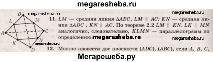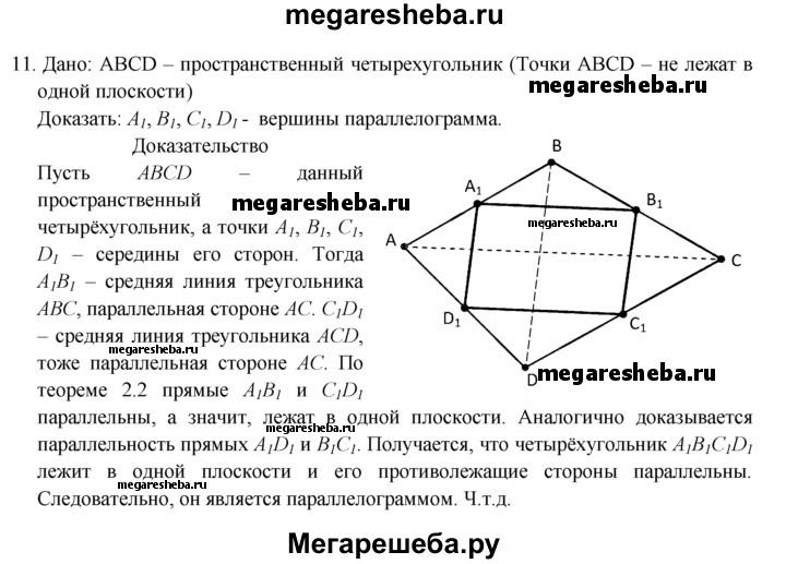 11.Докажите, что середины сторон пространственного четырехугольника являются вершинами параллелограмма (вершины пространственного четырехугольника не лежат в одной плоскости).