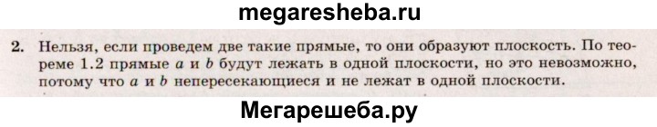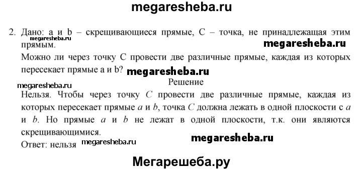 2.Можно ли через точку С, не принадлежащую скрещивающимся прямым а и Ь, провести две различные прямые, каждая из которых пересекает прямые а и b? Объясните ответ.
