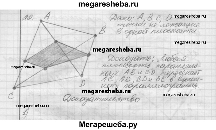22.Даны четыре точки А, В, С и D, не лежащие в одной плоскости. Докажите, что любая плоскость, параллельная прямым АВ и CD, пересекает прямые АС, AD, BD и ВС в вершинах параллелограмма.