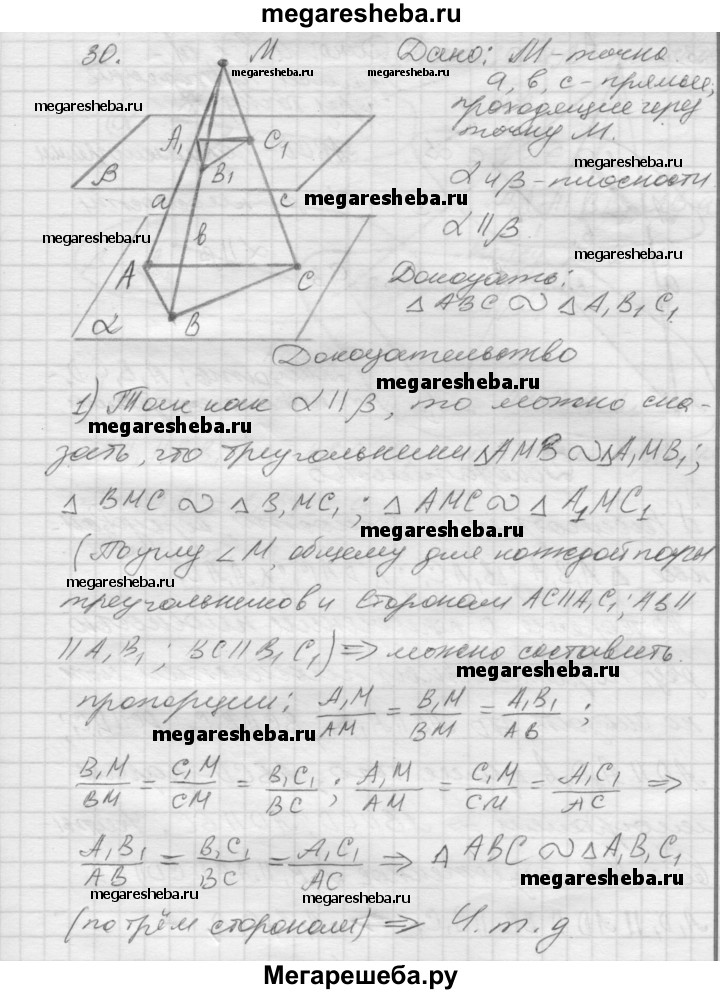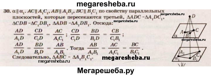 30.Три прямые, проходящие через одну точку, пересекают данную плоскость в точках А, В, С, а параллельную ей плоскость в точках А1, В1, С1. Докажите подобие треугольников ABC и А1В1С1.
