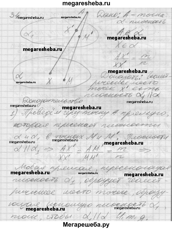 34.Точка А лежит вне плоскости α, X — произвольная точка плоскости α, X' — точка отрезка АХ, делящая его в отношении m : n. Докажите, что геометрическое место точек X' есть плоскость, параллельная плоскости а.