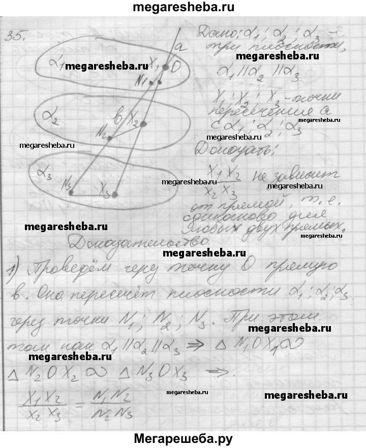 35.Даны три параллельные плоскости α1, α2, α3. Пусть Х1, Х2, Х3 — точки пересечения этих плоскостей с произвольной прямой. Докажите, что отношение длин отрезков Х1Х2 : Х2Х3 не зависит от прямой, т. е. одинаково для любых двух прямых.