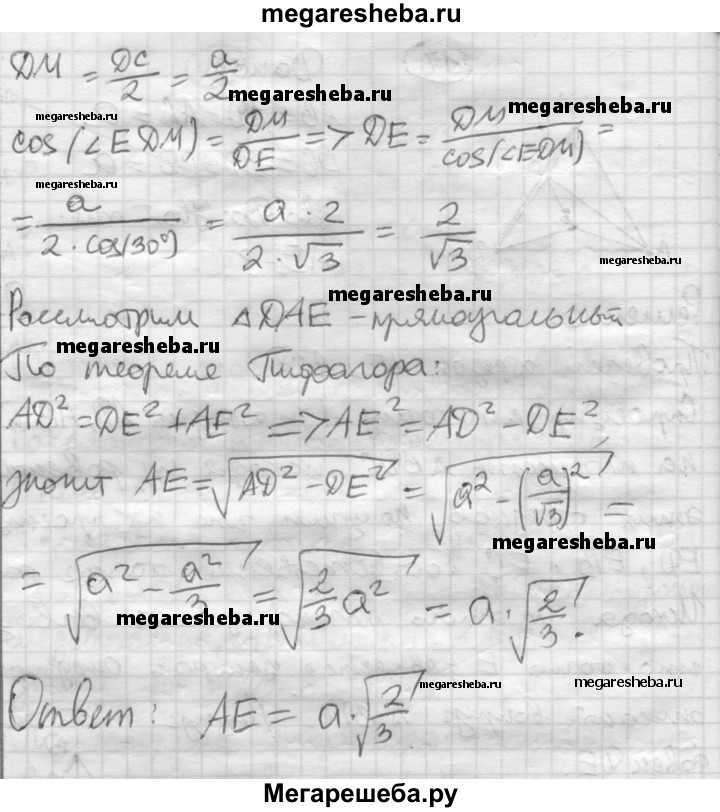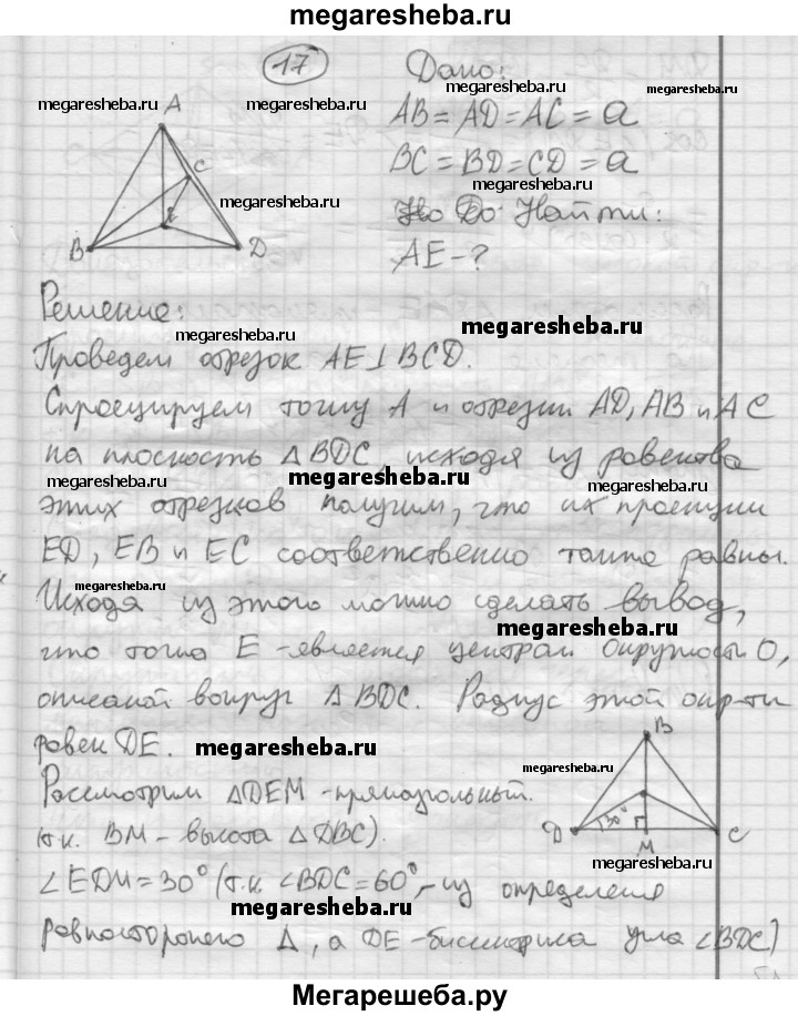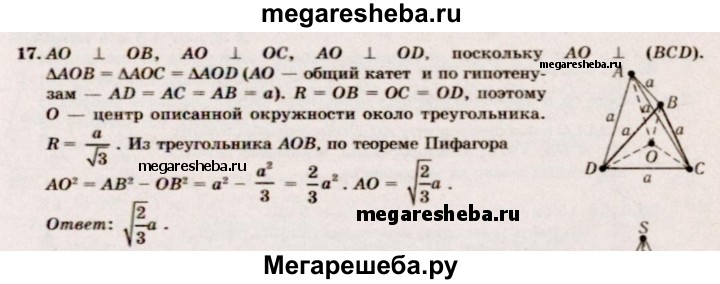 17. Точка А находится на расстоянии a от вершин равностороннего треугольника со стороной α. Найдите расстояние от точки А до плоскости треугольника.